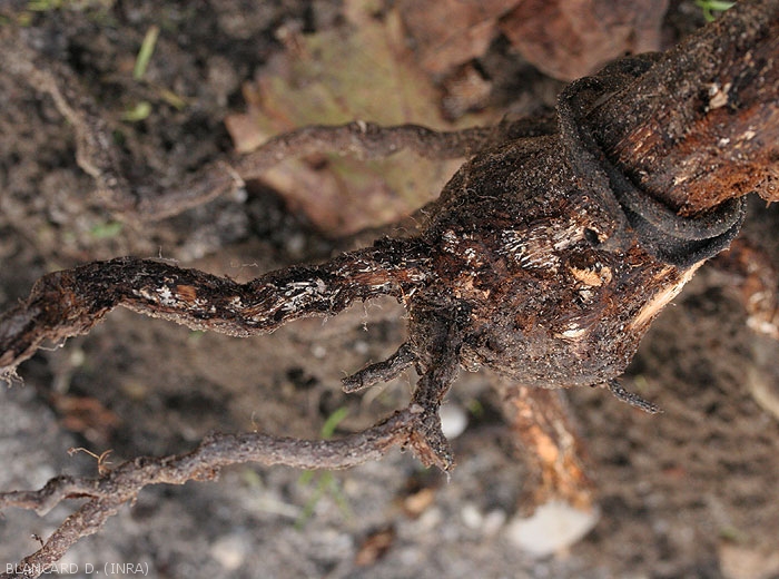 A veces, notamos en las raíces la presencia de rizomorfos, clases de cilindros de color marrón oscuro a negro, lisos y brillantes, de 1 a 1,5 mm de diámetro y diez o más centímetros de largo. De la armillaria, mechones de carpóforos se observan amarillo miel en los pies de las vides que mueren en otoño (figuras 5 y 6). - Rosellinia necatrix provoca síntomas diferentes a los anteriores. Fuera de la raíz, cuando las condiciones climáticas son favorables (humedad relativa alta), observamos telas miceliales blancas que se tornan de color gris ahumado, muy abundantes pero muy frágiles, teniendo la apariencia de una telaraña (facies al origen del nombre de esta enfermedad) . De manera más general, notamos la presencia de cordones blancos de estructura suelta que también se pueden encontrar en los intersticios del suelo.