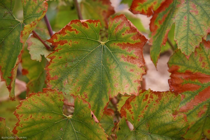 - una forma lenta caracterizada por una muerte progresiva de la planta que empequeñece y presenta cogollos que abortan. Los entrenudos son más cortos, las hojas más pequeñas pero generalmente no distorsionadas. En ocasiones, a mediados del verano y dependiendo de las condiciones climáticas, las hojas de las variedades de uva blanca se tornan amarillas y las de las variedades de uva negra enrojecen, esto antes de una defoliación prematura (figuras 7 a 10);