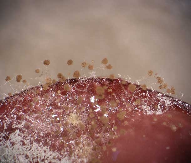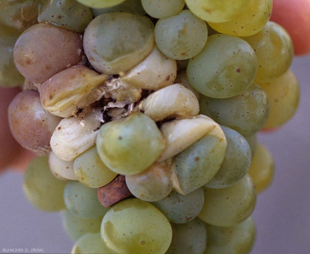 Solo unas pocas especies de esta sección se han asociado con alteraciones en las uvas: Aspergillus niger y Aspergillus carbonarius . Agreguemos que Aspergillus aculeatus también se ha descrito en Canadá como responsable de la pudrición de las bayas a partir de varias heridas.