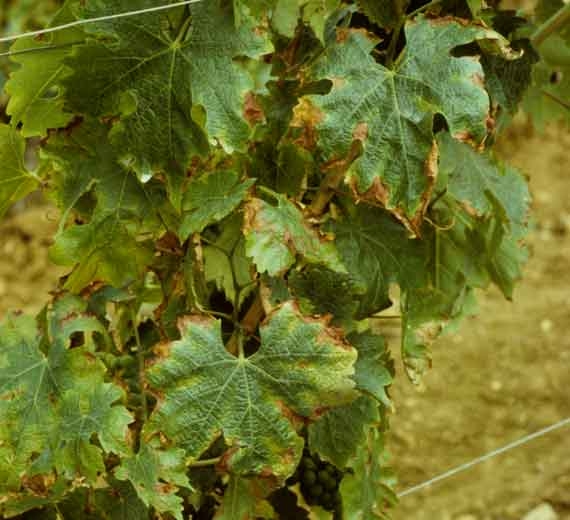 Reducción del vigor y vitalidad de las cepas. Hojas : decoloración del limbo que varía de amarillo a rojo anaranjado según la variedad de uva (figura 5). Hojas cayendo. Raíces : madurez temprana, bastante prematura. Bayas : reducción de maduración y cantidad. |
