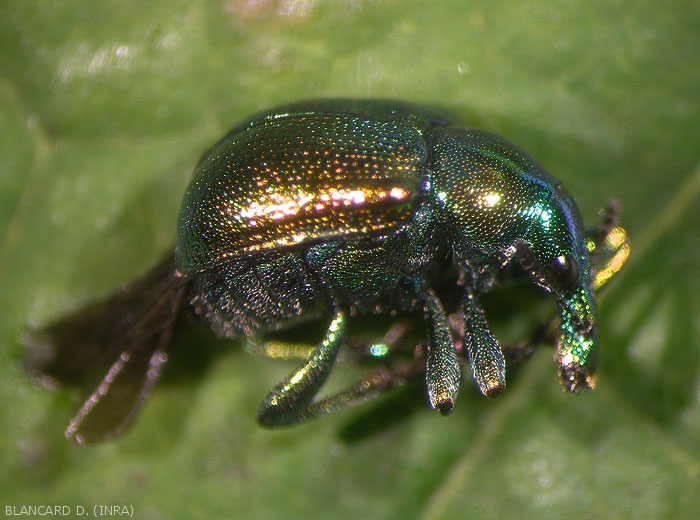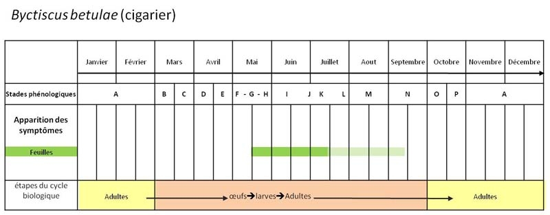 Byctiscus betulae pasa el invierno como adulto (figura 1) ubicado de 8 a 10 cm de profundidad en el suelo al pie de los tocones, o debajo de la corteza del tronco. Salen de la hibernación entre mediados de mayo y principios de junio, tienen una actividad diurna y se alimentan de los órganos verdes de la vid.