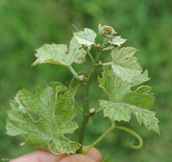 En verano, la superficie superior de las hojas atacadas que están expuestas al sol adquiere un tinte de marrón a bronceado. A medida que se acerca el envero, los brotes adquieren un tono blanquecino debido a los numerosos pinchazos.