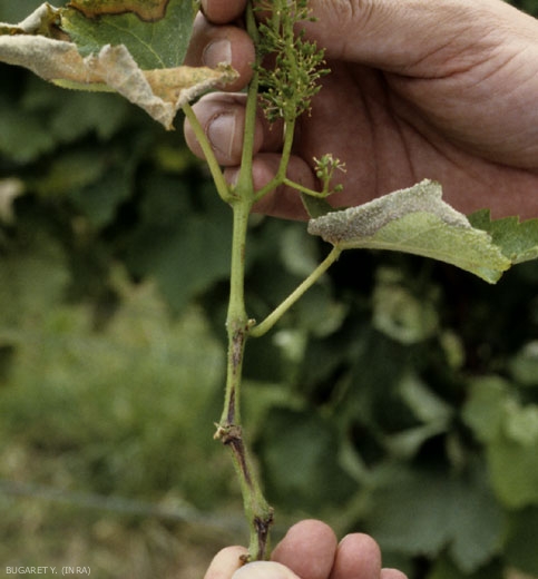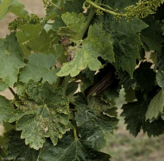 - Si X. ampelinus tiene un desarrollo epífito (en la superficie de las hojas inferiores de los brotes), esta bacteria, penetrando a través de los estomas y colonizando el parénquima, origina pequeñas manchas aceitosas angulares, de 1 a 3 mm de diámetro, de color marrón. tinte oscuro a término, y rodeado de un halo clorótico más o menos marcado (figuras 1 y 2). Nótese que cuando los ataques se producen sobre hojas jóvenes, estas en presencia de manchas pueden estar más o menos deformadas (figura 3).