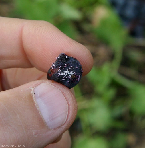 Penicillium expansum Principalmente y algunas otras especies de Penicillium spp. son responsables de una podredumbre suave y húmeda en las uvas, cuyo color es ligeramente azul oscuro en las variedades de uva negras (figura 1) y de beige a rojizo en las variedades de uva blancas (figuras 2 y 3). Cabe señalar que los tejidos podridos se van cubriendo gradualmente de almohadillas portadoras de esporas, cuyo color fluctúa con el tiempo (figuras 4 y 5). Primero blanquecinos, se vuelven azules ( podredumbre azul, moho azul) o incluso gradualmente verdes y se oscurecen.