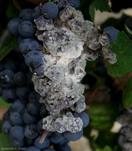 Así, en racimos botrytizados, podemos observar el desarrollo de un moho bastante característico, blanquecino a rosado, cubriendo gradualmente el moho gris (Figuras 1 a 4).