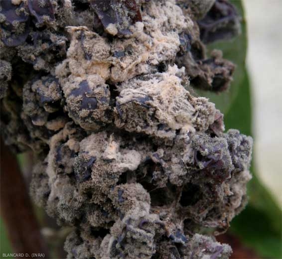Este hongo esporula abundantemente en la superficie de las bayas podridas cubiertas por el moho gris de B. cinerea (Figura 1). Sus conidios se dispersan por corrientes de aire y / o salpicaduras de agua después de las lluvias.