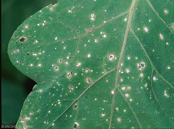 • Posteriormente, las manchas se extienden, se vuelven marrones y gradualmente se van necrosando. Un borde marrón rojizo los rodea. Su diámetro puede ser superior a 1 cm.