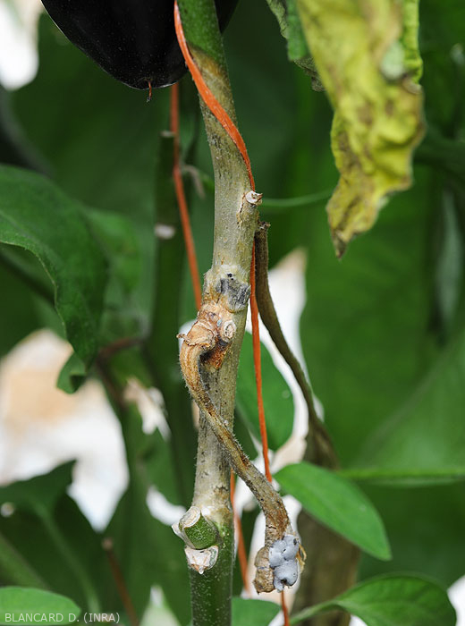 Lesiones alargadas en tallos que se inician a partir de tejidos senescentes o lesionados (frutos abortados, partes florales, hojas senescentes, heridas de poda y varios ...). Estos pueden localizarse cerca del collar o distribuirse a lo largo de los tallos. Aparecen húmedas y oscuras al principio, luego se necrotizan y adquieren un tinte amarillento y marrón, y finalmente las rodean varios centímetros (Figuras 1 a 3).