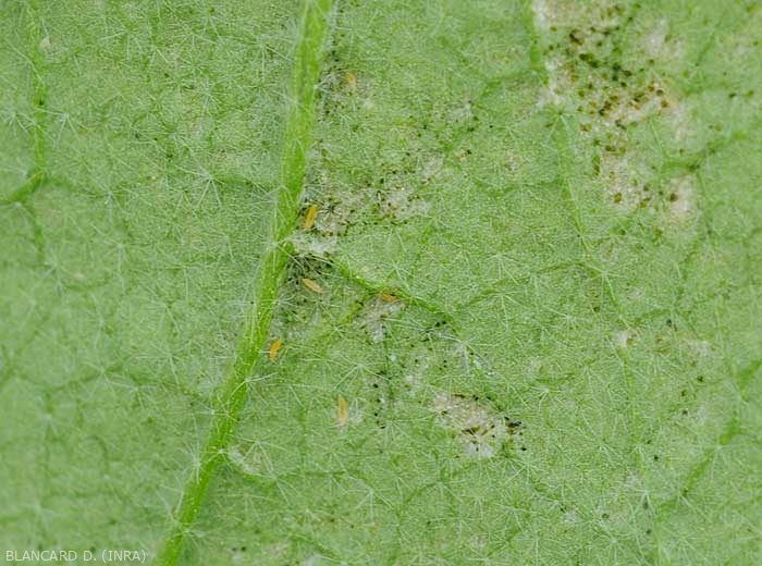 - Signos : Presencia de pequeños insectos sobre los órganos vegetales afectados (figuras).