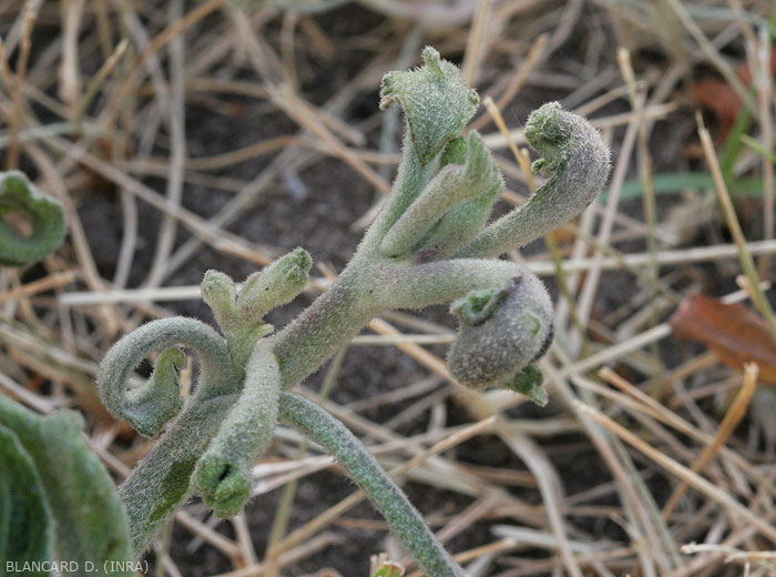 - Ramitas, coronas, raíces: hinchazón de su corona, raíces rugosas en tallos, etc. (figura);