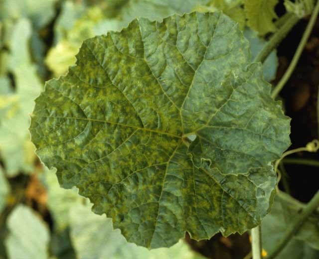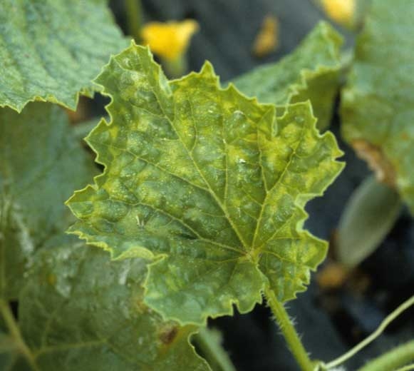 En pepino: Se observan síntomas de mosaico fuerte en el follaje y en los frutos. En variedades de frutos largos cultivadas en invernadero, podemos notar un marchitamiento repentino de la planta a los pocos días de la inoculación, incluso antes de la aparición de los síntomas del mosaico.