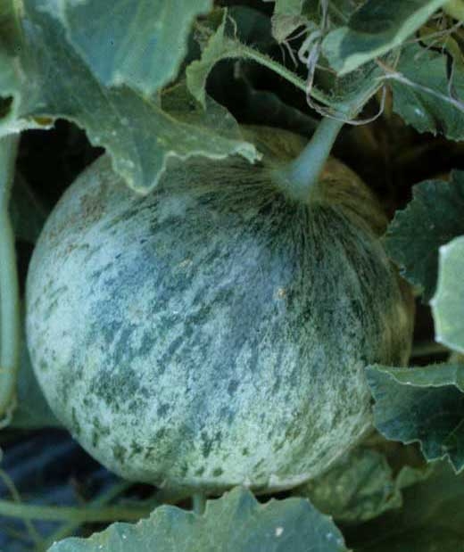 En sandía: la sandía rara vez se infecta con CMV, que con mayor frecuencia causa manchas negras necróticas