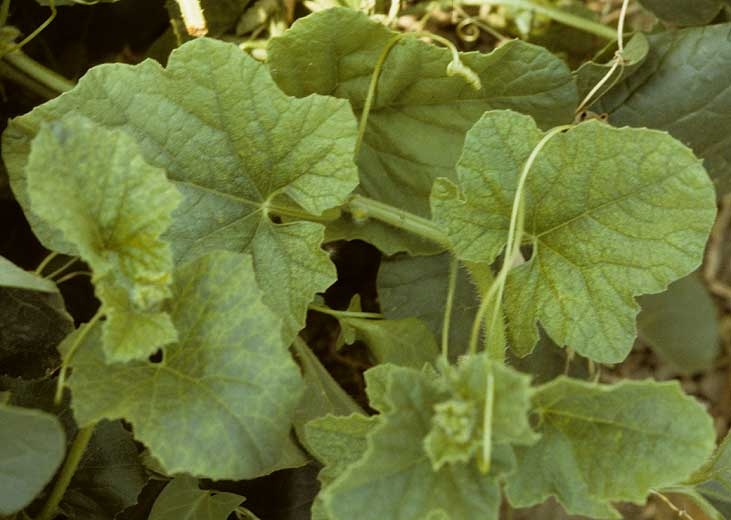 Los primeros síntomas se expresan en el melón en forma de una o pocas manchas cloróticas en la hoja inoculada, se generalizan y luego evolucionan en mosaico (figuras 1 a 8). La intensidad de los síntomas varía mucho de una variedad a otra y suelen ser más graves en verano. En Francia, en melones tipo Charentais, se observa un mosaico clásico en el follaje y en ocasiones en los frutos y una reducción general del vigor de la planta (figura 2). Con una infección temprana, la producción puede verse seriamente comprometida. En otras variedades de melón, el mosaico puede ser mucho más severo y la planta se atasca.
