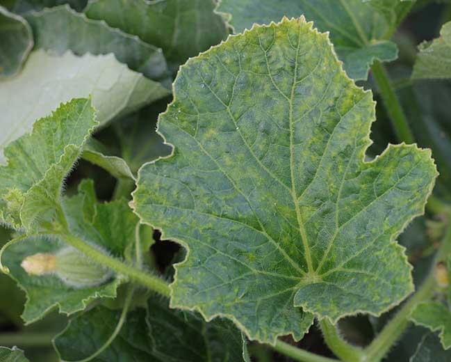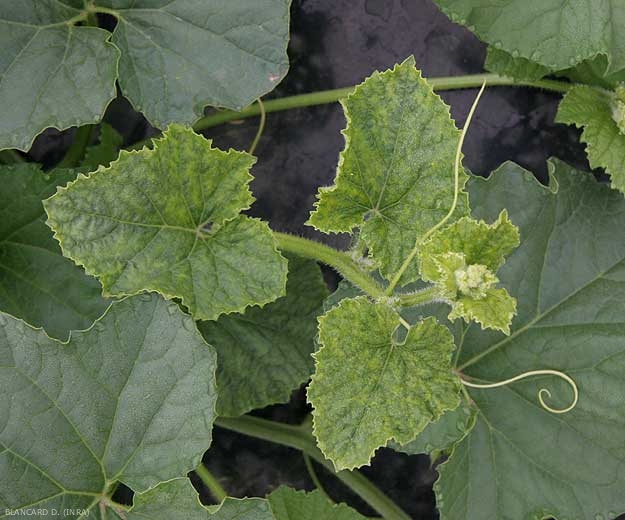En calabacín: Los síntomas comienzan con manchas cloróticas en las hojas inoculadas. A medida que el mosaico crece, las hojas se enrollan sobre sí mismas, se deforman, la planta se cuelga y adquiere una apariencia amarillenta. Los primeros frutos producidos muestran pequeñas depresiones en "pinchazos" más o menos pronunciadas, luego todas las flores se hunden y la fructificación se detiene. En el calabacín, el CMV es más común en los períodos fríos (primavera, otoño). Además, notamos una mayor sensibilidad de las plantas jóvenes (hablamos de resistencia o menor sensibilidad en la etapa "adulta").
