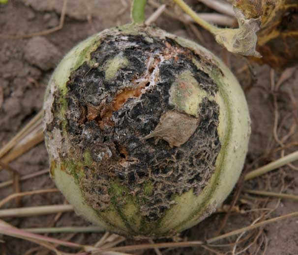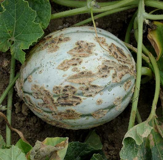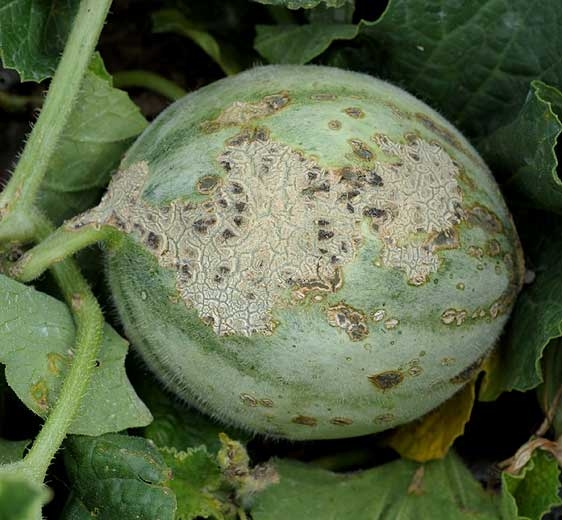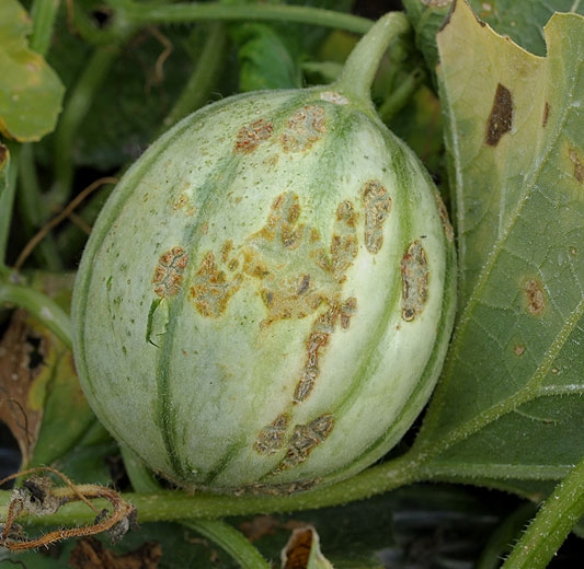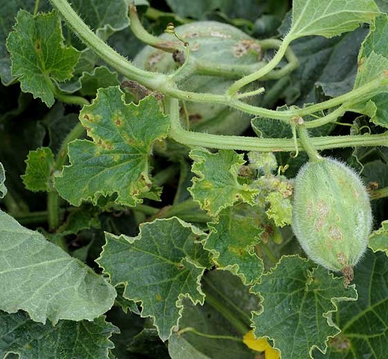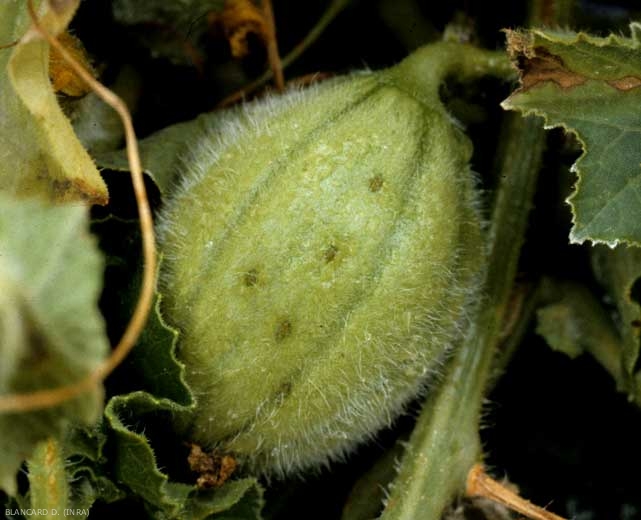 En los melones (figuras 13 a 21), las manchas, pequeñas y aceitosas al principio en los melones jóvenes, se extienden, alargan y se suberizan localmente. Los fructíferos de cuerpos C. cucumerinum se forman en el centro de las manchas y les dan un color verde oscuro a negro.