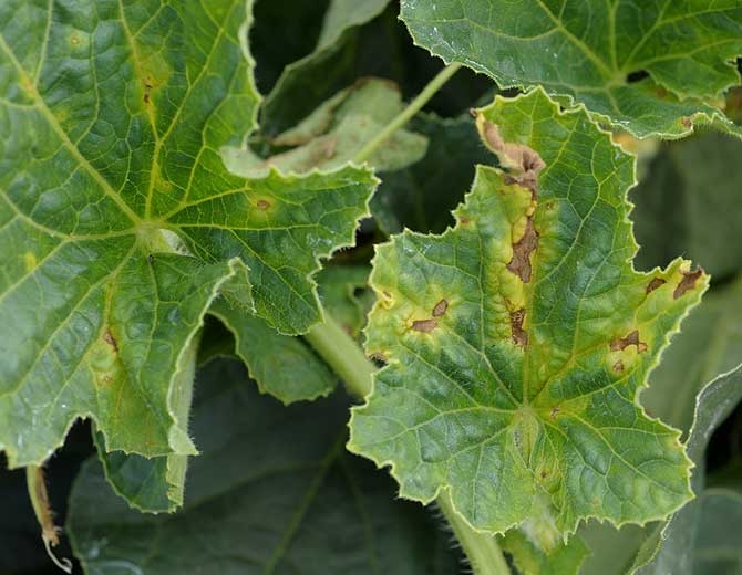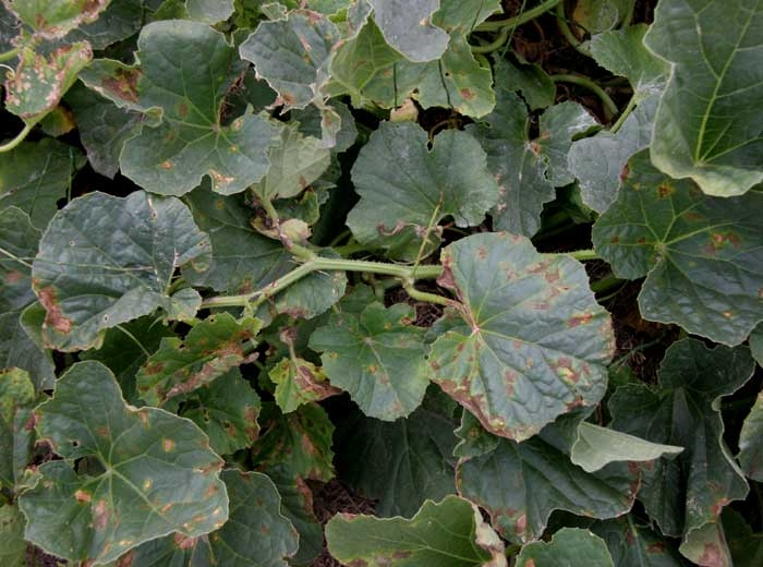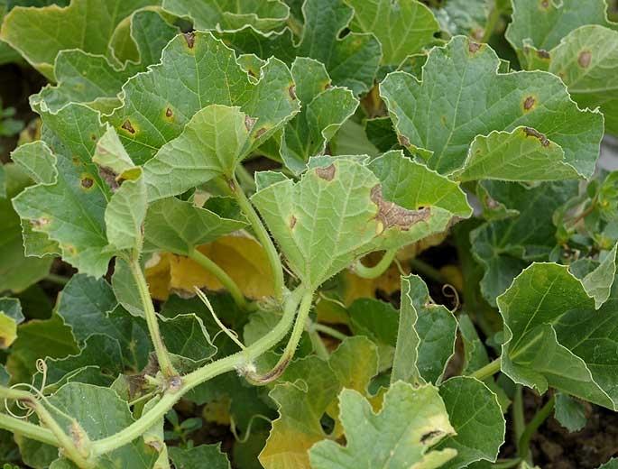 A aparecen pequeñas lesiones húmedas en hojas menudo las más jóvenes. Estas lesiones se extienden gradualmente para formar manchas más o menos circulares, que se tornan marrones y necrosan con la edad. A veces pueden tomar un tinte grisáceo y tener un halo amarillo más o menos ancho. El tejido afectado puede aflojarse y caer, dando a la parte interna de las manchas un aspecto más o menos estrellado y a las hojas un aspecto acribillado. Tenga en cuenta que las lesiones húmedas a veces comienzan en venas que se vuelven marrones localmente. En las hojas de melón (Figuras 2 a 7) aparecen manchas marrones, pequeñas y necróticas. También pueden ser grisáceos, marrones en la periferia, a veces angulares, rodeados de un halo amarillo. También se forma una necrosis parda de los nervios.