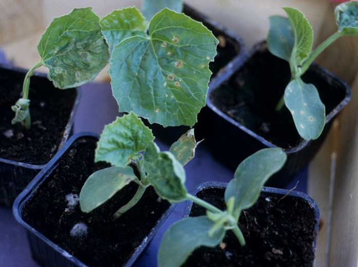 Todos los órganos aéreos de las cucurbitáceas pueden presentar síntomas de turbidez gris causada por Cladosporium cucumerinum , incluso en una etapa juvenil en el vivero (Figura 1). Los síntomas observados en especies de esta familia botánica suelen ser bastante comparables, y se les podría atribuir las siguientes descripciones genéricas: