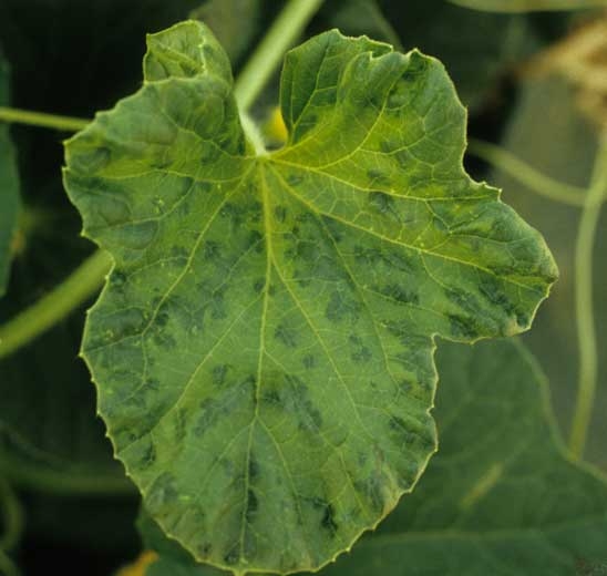 - En sandía : En esta especie, como en el pepino o el calabacín, se pueden observar variaciones significativas en la expresión de los síntomas según la cepa: algunas no provocan síntomas mientras que otras provocan mosaicos deformantes.