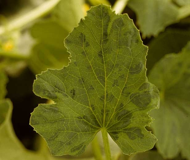 - En melones : los síntomas en el follaje pueden ser un mosaico más o menos fuerte, a menudo acompañado de un color verde oscuro a lo largo de las venas (llamado vein-banding) y una ligera contracción del follaje (figuras 1 a 3). A veces los síntomas son mucho más pronunciados y puede haber una reducción dramática en el tamaño de las hojas (Figuras 4 y 5) que pueden no alcanzar más de uno o unos pocos centímetros de longitud y estar muy distorsionadas. El crecimiento de las ramitas no parece verse afectado, lo que puede dar un aspecto particular de ramita sin hojas.