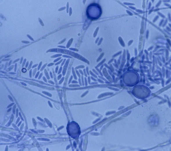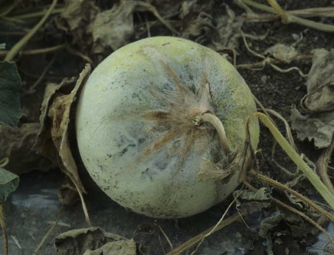 En condiciones de humedad, F. oxysporum f. sp. melonis fructifica abundantemente en lesiones formadas en tallos y frutos (Figuras 1 y 2). Estos están cubiertos de innumerables cuerpos fructíferos y esporas (Figura 3). Este inóculo potencial representa importantes fuentes de contaminación en el origen de la muy fácil diseminación de este hongo. Se dispersa a través del viento, salpicaduras y escorrentías de agua, equipos y herramientas. Tenga en cuenta que durante la labranza, el inóculo se redistribuye en la parcela y se disemina mediante el equipo de labranza.