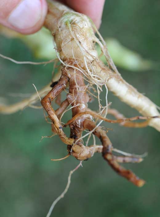 Después de haber arrancado y lavado cuidadosamente los sistemas radiculares de algunas plantas enfermas, vemos que están más o menos estropeadas y podridas (figura 4). Las raíces han desaparecido y las que quedan presentan lesiones necróticas de color marrón rojizo más o menos extensas (Figuras 5 y 6). El tejido de la raíz eventualmente se pudre y se descompone; eventualmente, los sistemas de raíces son bastante pequeños. Tenga en cuenta que el pivote y la parte inferior de la varilla pueden estar más o menos alterados (figura 7).