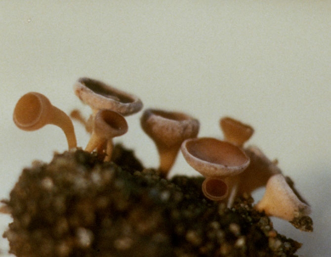El teleomorfo de estos hongos a veces es visible en la superficie del suelo. Pequeñas "trompetas", apotecios (Figura 12), se forman en los esclerocios más grandes. Producen ascosporas , la fuente de contaminación del aire.
