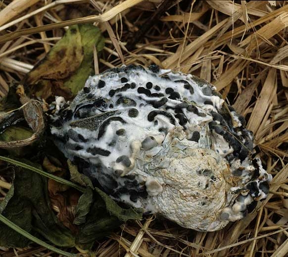 El micelio más o menos esponjoso y blanco se forma en todos los tejidos afectados (Figuras 2, 5 y 7), así como grandes estructuras irregulares negras, bastante alargadas, que miden 2-20 mm x 3-7 mm de esclerocios (figuras 5 y 8 a 11).