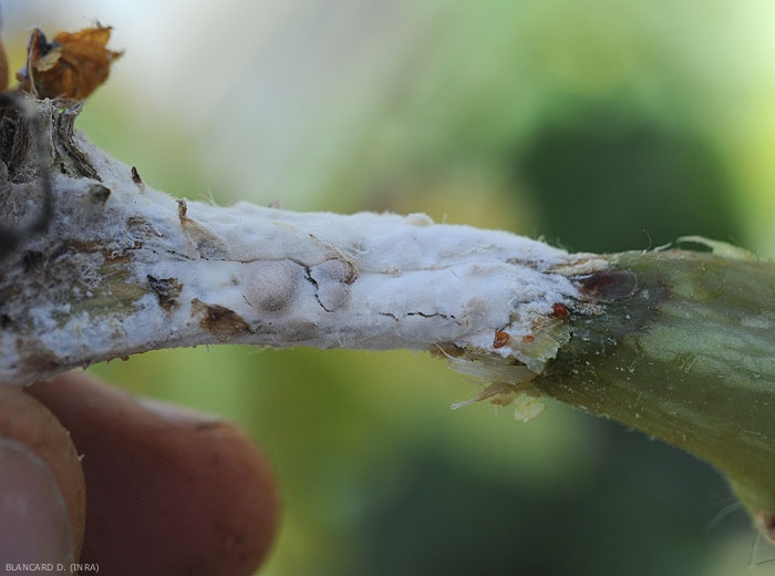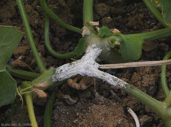 Provoca lesiones alargadas en el tallo a partir de tejidos senescentes o lesionados (frutos abortados, zarcillos, partes florales, hojas senescentes, etc.). Estos pueden ubicarse cerca de la corona o más arriba en la planta, especialmente cuando los melones están entrenados. Tienen un aspecto húmedo y oscuro (Figuras 1 a 5), y terminan por ceñirlo varios centímetros. De los exudados, a veces, es una gota gomosa de color marrón (figuras 2 a 4). Tenga en cuenta que en la parte distal de la rama ceñida, las hojas pueden volverse amarillas, marchitarse y secarse.