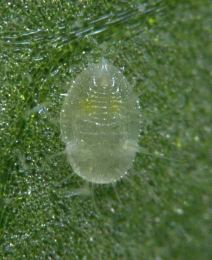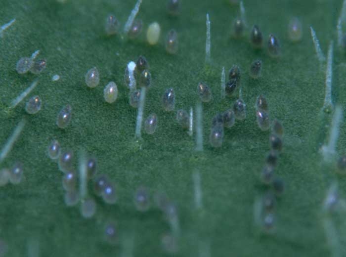 - Etapas de desarrollo : los huevos (figuras 2-1 y 2) (figuras 4 y 5) se depositan principalmente en el envés de los folíolos en el ápice. De color blanco, son ovalados y tienen un diámetro de 0,25 mm. En los días siguientes a la puesta oscurecen. Entre 7 y 10 días después, las eclosionan larvas (figuras 2-3) (figuras 6 y 7); estos, ovalados y planos, miden 0,3 mm y tienen antenas y patas bien desarrolladas.