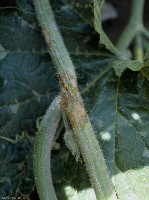En plantas jóvenes y adultas, a veces aparece una lesión húmeda que se oscurece progresivamente en el tallo al nivel del suelo (Figura 1); esto una vez rodeado conduce a un marchitamiento más o menos irreversible de las plantas y su muerte a largo plazo. Tenga en cuenta que los vasos subyacentes a esta lesión son más o menos marrones. Las raíces pueden pudrirse, por lo que se vuelven blandas y adquieren un tinte marrón antes de descomponerse.