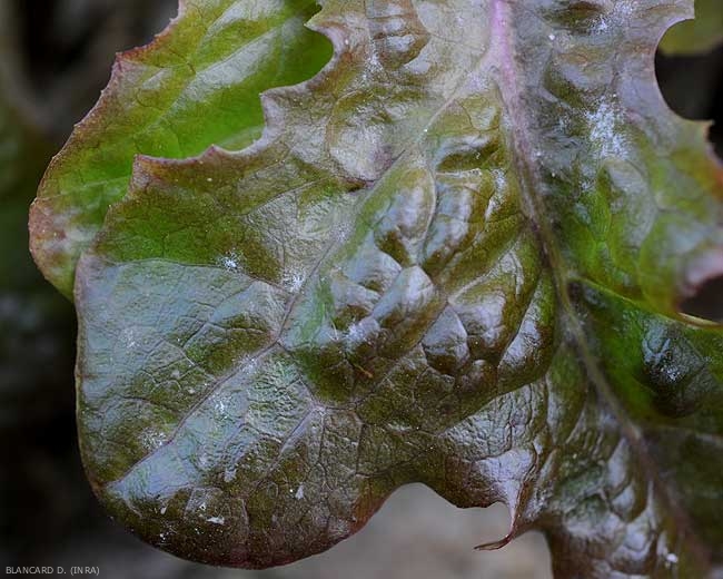Algunas manchas blancas en polvo salpican el limbo de esta hoja de lechuga. <b> <i> Golovinomyces cichoracearum </i> var. <i> cichoracearum </i> </b> (mildiú polvoroso).
