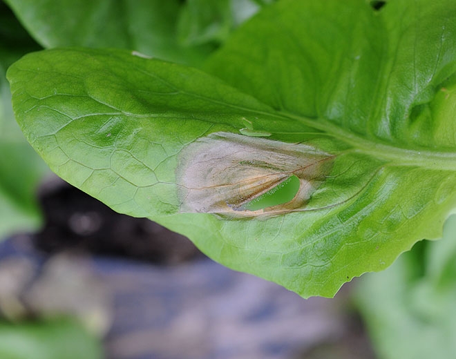 Una mancha de color beige a marrón claro se desarrolló en una hoja de esta lechuga.  <b> <i> Botrytis cinerea </i> </b> (moho gris).