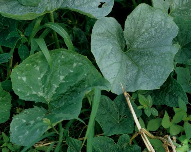 La hoja de esta hoja de calabaza es completamente plateada.  (<b> plateado </b>)
