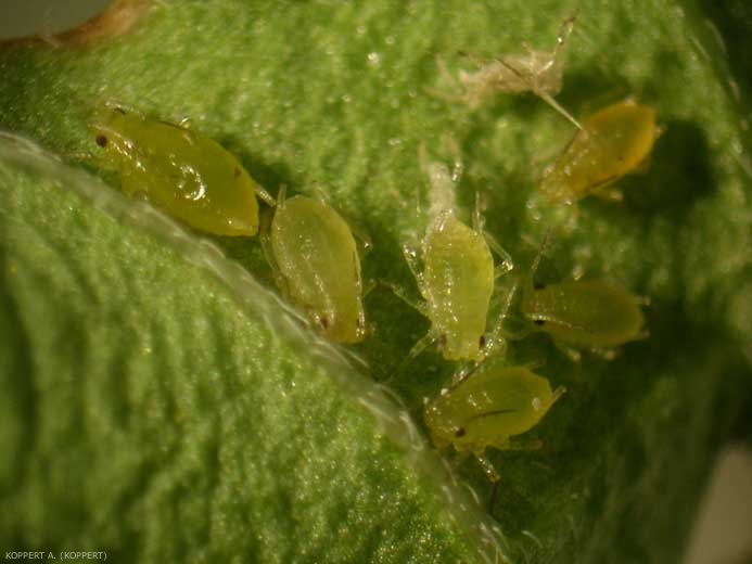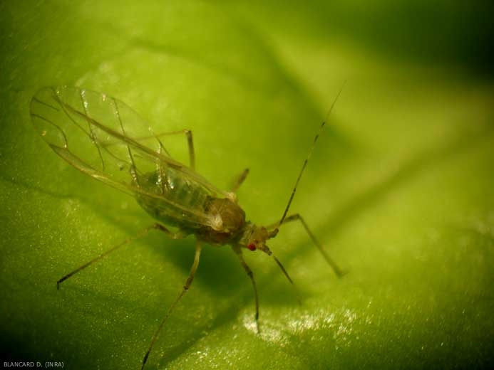 - Dispersión en el cultivo : unas pocas plantas esparcidas por el cultivo sobre las que rápidamente adquieren importancia las colonias de pulgones constituyen los primeros brotes. Primero sin alas, los pulgones comienzan visitando plantas vecinas. Tan pronto como aparecen los adultos (durante los brotes), se dispersan en el cultivo o en parcelas cercanas. Las plantas y los trabajadores pueden contribuir a su propagación.