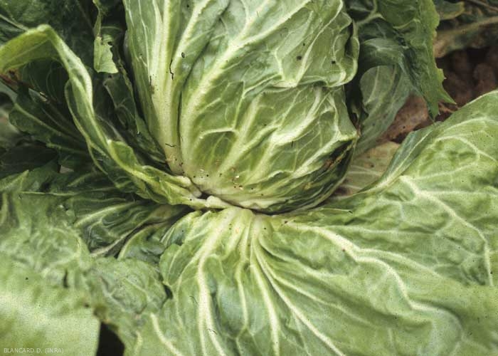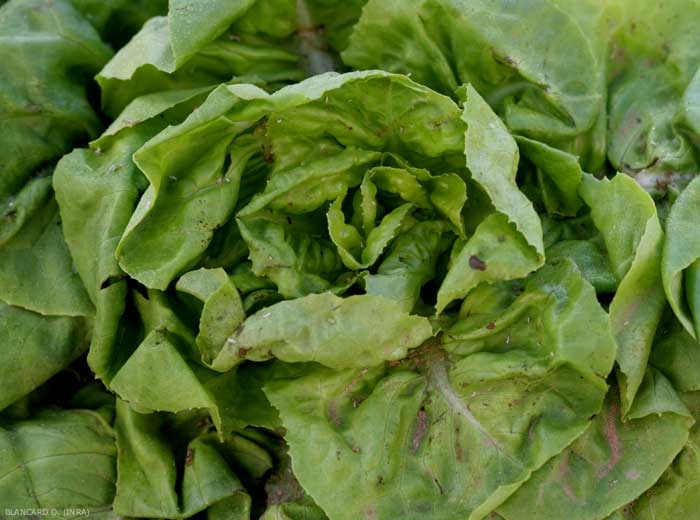 Varias especies de pulgones * ( pulgones ) pueden formar colonias en las hojas tiernas de lechuga (figuras 1 a 5), ​​esto del vivero: Myzus persicae  (Sulzer 1776) (figura 6), Nasonovia ribisnigri (Mosley) (pulgón de la lechuga ), Aphis gossypii (Glover 1877) (en invernaderos en particular) (figura 7), Macrosiphum euphorbiae (Thomas 1878) (figura 8), Hyporomyzus lactucae  (L.) ...
