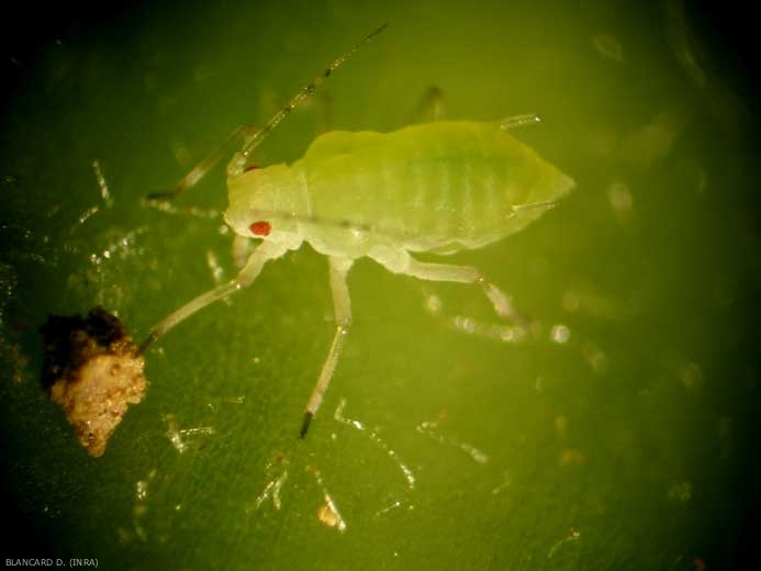 Se jóvenes larvas forman , que inmediatamente se alimentan de la savia y mudan 4 veces antes de dar a luz al adulto. Las blancas mudas (exuviae) en la vegetación indican la presencia de pulgones en el cultivo. Los adultos tienen alas (1) o no; en el último caso, hablamos de individuos “sin alas” (2) (figuras 9 a 11). Cada individuo puede dar a luz de 40 a 100 crías dependiendo del anfitrión y las condiciones climáticas en particular.