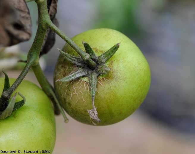 Las frutas también se ven afectadas. Están más o menos bien coloreados; eventualmente, a menudo son más pequeñas y muestran áreas corchosas más o menos extensas (Figuras 7 y 8), o incluso hendiduras (Figura 9).