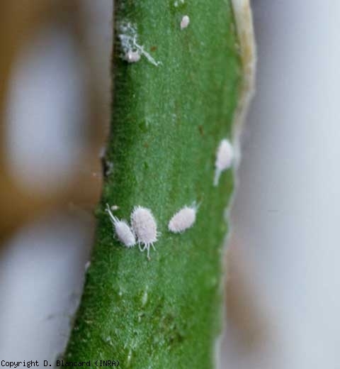Cochinillas ( insectos escala ) son insectos pertenecientes al orden Hemiptera y a la superfamilia de cocoides morder chupadores. El tomate se ve especialmente afectado por algunas cochinillas pertenecientes a la familia Pseudococcidae. Las cochinillas de esta familia carecen de un escudo córneo (una especie de caparazón) y el cuerpo suele estar cubierto de una secreción harinosa blanca. También tienen filamentos cerosos laterales claramente visibles en la periferia del cuerpo, y a veces se puede notar una secreción algodonosa que contiene los huevos al final del abdomen. Estaremos particularmente interesados ​​aquí en Pseudococcus viburni (Signoret) (sin. Pseudococcus affinis [Maskell]) que se introdujo en los Países Bajos, a principios de 1990, y comenzó a observarse en Francia a partir de 1997. Esta cochinilla se encuentra ahora en un número significativo de refugios repartidos por varias regiones de producción francesas.