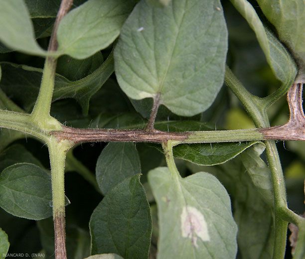 De las lesiones de cancro más o menos extendidas, de color marrón , de forma irregular, son visibles en los bastones (Figura 8) y pecíolos (Figura 9). A menudo los rodean más o menos. Se pueden observar oscurecimientos similares en ramos de flores; están en el origen de la caída de muchas flores.