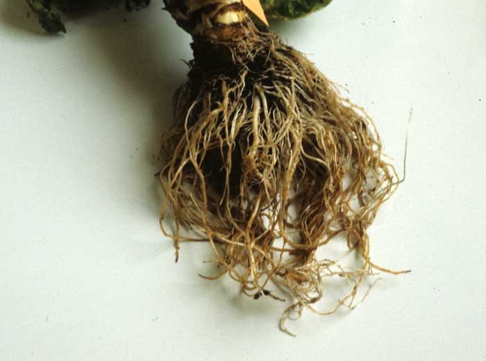 D'une manière assez générale, les Pythium spp. s'attaquent surtout aux semences et aux jeunes plantules après semis en pépinière, en pré- et post-émergence. Ils sont capables d'inhiber la germination, de coloniser rapidement les jeunes tissus succulents, tendres et non lignifiés, des racines et du collet. Par la suite, il est assez courant d'observer des plantules, localisées au même endroit (en foyer), qui flétrissent, jaunissent, se déssèchent et disparaissent plus ou moins rapidement (figure 1). C'est un syndrome classique que l'on dénomme "fontes de semis". En plus des Pythium spp., d'autres agents pathogènes peuvent être responsables de telles fontes ; quelques-unes de leurs caractéristiques sont mentionnées dans le lien Critères de distinction des principaux champignons sur plantules. Comme vous pourrez le constater, les symptômes qu'ils engendrent sur les racines sont assez comparables et il n'est donc pas aisé de les différencier à l'oeil nu. Ils affectent soit les racines, soit la partie de la tige située à proximité du niveau du sol ou du substrat, entraînant l'étranglement de cette dernière. Dans certaines situations, les effets de ces champignons sur les salades perdurent en cours de saison. On constate parfois une réduction plus ou moins importante de la croissance des plantes ou ces dernières flétrissent brutalement. Dans tous les cas, lorsqu'on arrache les plantes, on constate les effets des Pythium spp. sur les racines : brunissements racinaires plus ou moins généralisés, disparition de nombreuses radicelles (figure 2) et parfois altérations vasculaires et du collet. Par exemple en Californie, Pythium uncinulatum est responsable du faible développement du système racinaire des salades ainsi que de la dégradation de l'extrémité des racines. De plus, cette même espèce est associée en Hollande à l'altération des feuilles basses des salades, tout comme P. aphanidermatum, en Inde, qui colonise les feuilles en contact avec le sol et entraîne une pourriture humide et translucide pouvant se généraliser à la pomme entière (voir la fiche Pythium spp.).