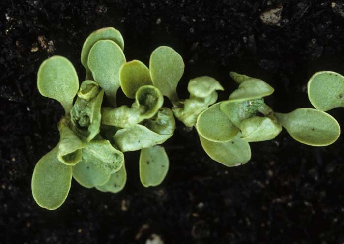 Certains pesticides peuvent être à l'origine de phytotoxicités induisant des modifications plus ou moins marqués du port des salades, des malformations foliaires et une réduction, voire un arrêt total de la croissance des plantes. Les figures 1 à 6 permettent de se faire une opinion sur la nature et l'intensité des symptômes induits par certains composés phytotoxiques. On peut notamment observer :