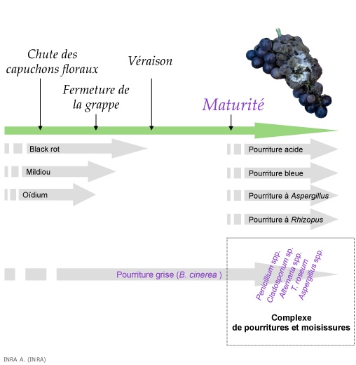Ces agents de pourritures sont responsables certaines années de pertes qualitatives et quantitatives à la récolte parfois considérables. Au cours de leur développement sur les baies, plusieurs d'entre eux sont susceptibles de produire des mycotoxines et/ou des composés aromatiques défavorables dépréciant les qualités sanitaire et/ou organoleptique des vins.