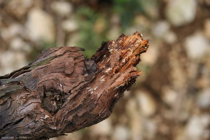 • una forma apopléjica en el origen de un marchitamiento repentino generalizado o parcial de la vid. En este último caso, se podrán observar uno o más brazos muertos al año siguiente. Las hojas eventualmente se marchitan y caen. Cabe señalar que esta forma apopléjica puede presentarse en viñas aparentemente sanas y generalmente muy fructíferas o en viñas que ya están muriendo.