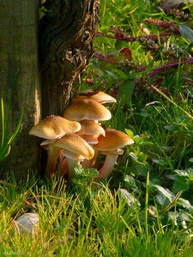 A veces, notamos en las raíces la presencia de rizomorfos, clases de cilindros de color marrón oscuro a negro, lisos y brillantes, de 1 a 1,5 mm de diámetro y diez o más centímetros de largo. De la armillaria, mechones de carpóforos se observan amarillo miel en los pies de las vides que mueren en otoño (figuras 5 y 6).