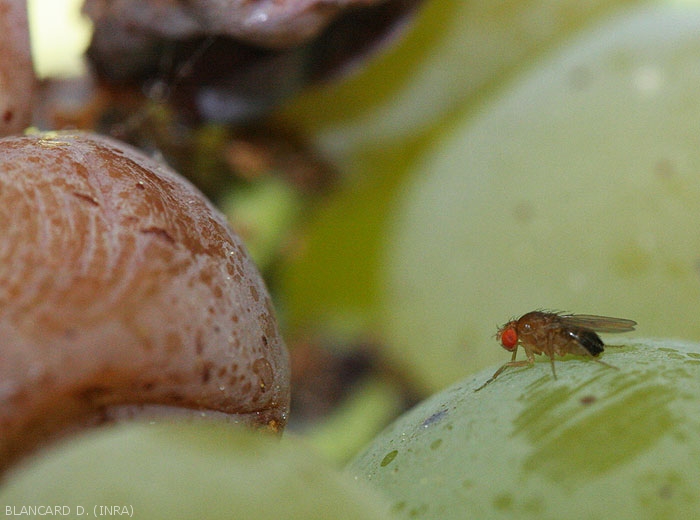 - el adulto (Figuras 1-5) es una mosca con alas hialinas inmaculadas, ojos compuestos rojos y una coloración amarillenta a pardusca.