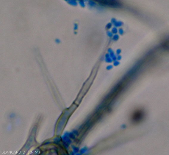 Las conidias producidas por los picnidios de P. chlamydospora (figura 3) contaminan las heridas de poda, luego ingresan a ellas durante el invierno, durante los períodos climáticos templados y lluviosos. Tenga en cuenta que las infecciones también pueden ocurrir por cualquier otra lesión durante todo el año. P. aleophilum (figura 4) también es capaz de contaminar las heridas de poda, con mayor frecuencia durante el período vegetativo de la vid (chupón, desbroce, etc.); Se observaron picos de emisión de conidios a lo largo de este tiempo.