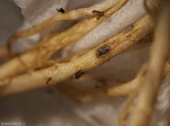 - Lesiones en raíces de extensión limitada, húmedas, de color marrón a negro, a veces suberizadas superficialmente. Están presentes en cantidades reducidas en las raíces principales.