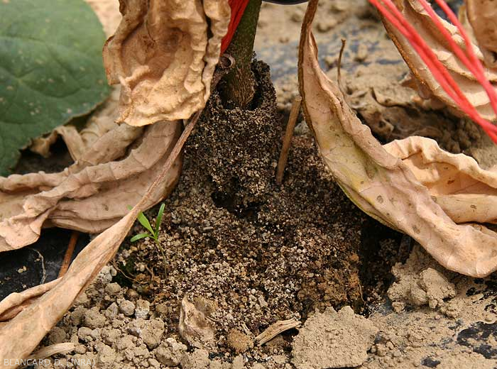 Signos : Presencia de pequeñas cúpulas cónicas terrosas en la base de los tallos de berenjena.