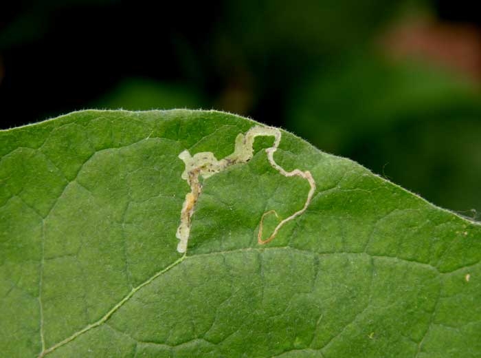 - Larvas excavando en los folíolos de las galerías que la presencia de excrementos negros hace claramente visibles. Las larvas blancas del tercer estadio perforan la lámina de la hoja, dejan los folíolos, caen en pliegues de plástico o en el suelo y se entierran poco a poco.