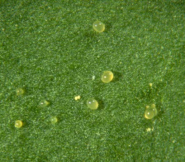 - Los huevos se depositan principalmente en el envés de las hojas. Son redondos, diminutos (0,14 mm de diámetro), translúcidos al principio, luego se vuelven opacos y finalmente se vuelven amarillos a medida que se acercan a la eclosión.